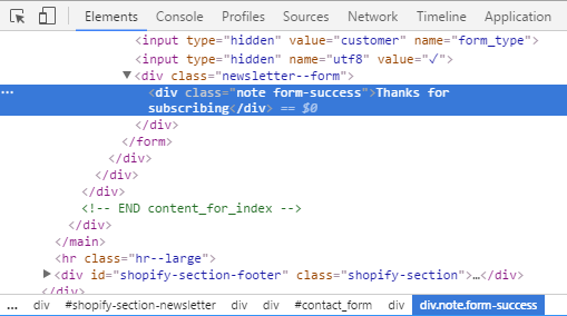 A developer’s console will appear with a lot of HTML code. Note that success message’s code is already selected in that console. That message does not have any unique ID so we’ll need to utilize CSS Selectors.