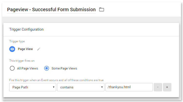 And do not forget to properly name the trigger, e.g. “Pageview – Successful Form Submission”. A title must be clear. Otherwise, you’ll have a mess in your Google Tag Manager account (in the long run). You can read more about naming tips (a.k.a. Naming Conventions) here.
