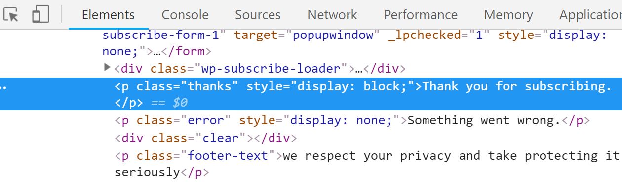 Let’s create a DOM Element variable and try to scrape the “Thanks for subscribing” text.