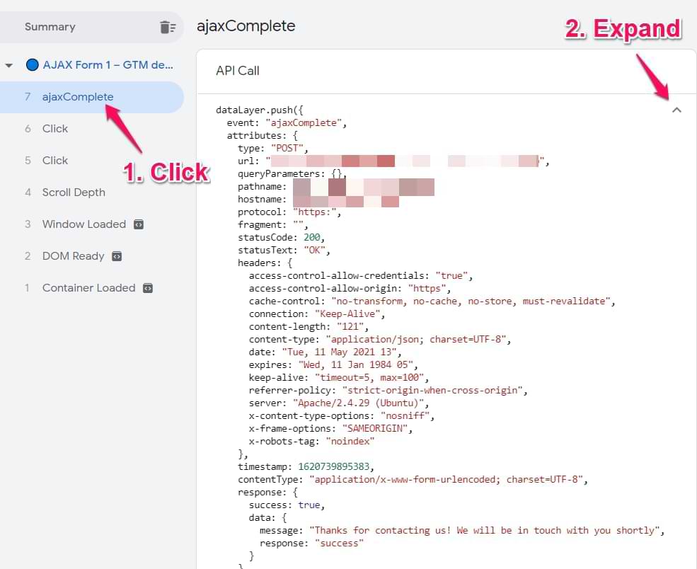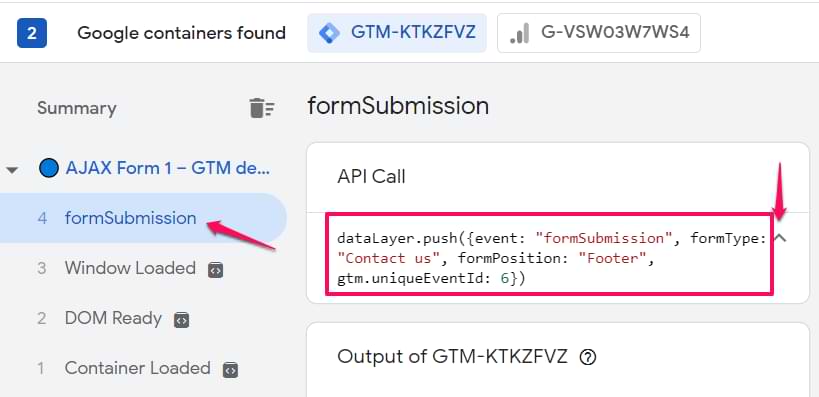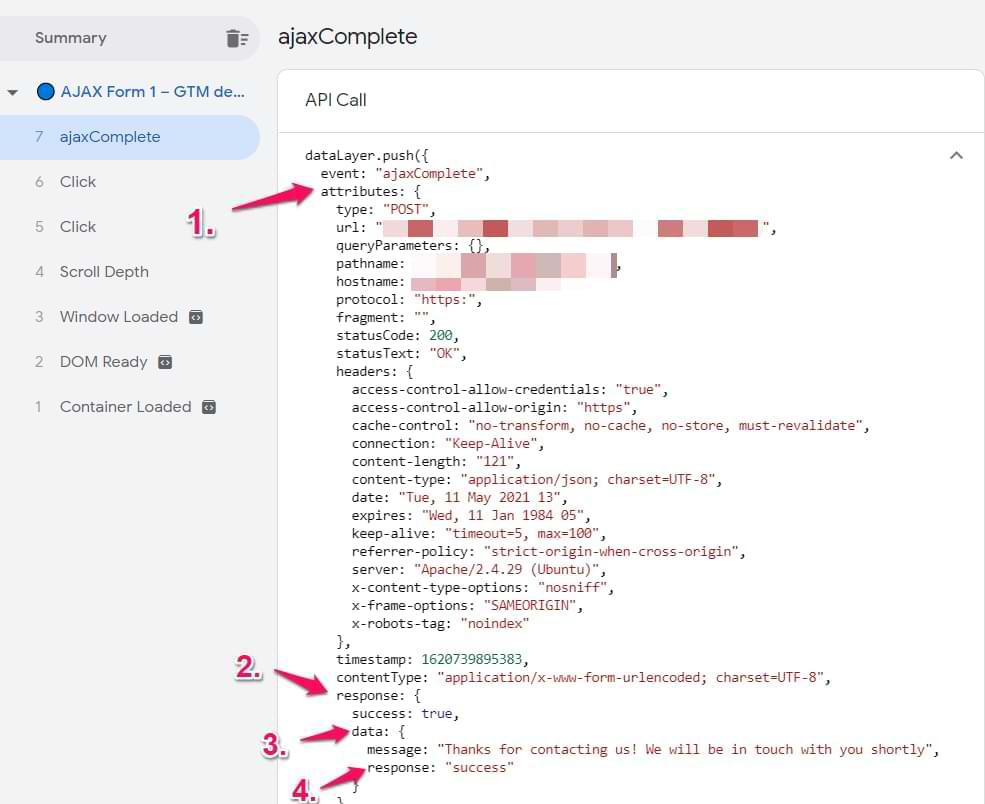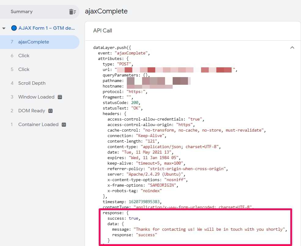 Check whether all data is correctly pushed to the dataLayer. Click formSubmission event and then the API call in the Preview console. Data should look like this: