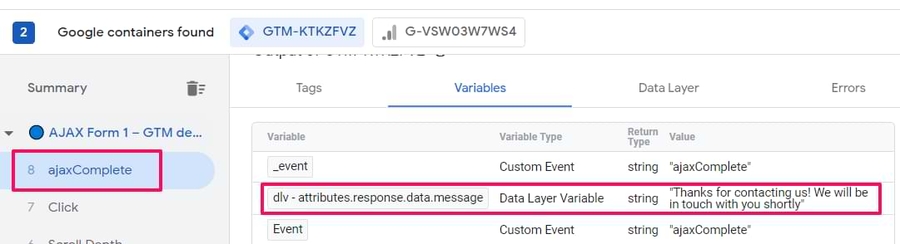 Then fill in the AJAX form and submit it. After successful submission, Google Analytics 4 Event Tag should fire (it will be displayed in Preview and Debug mode. You should also check Google Analytics 4 Debug View.