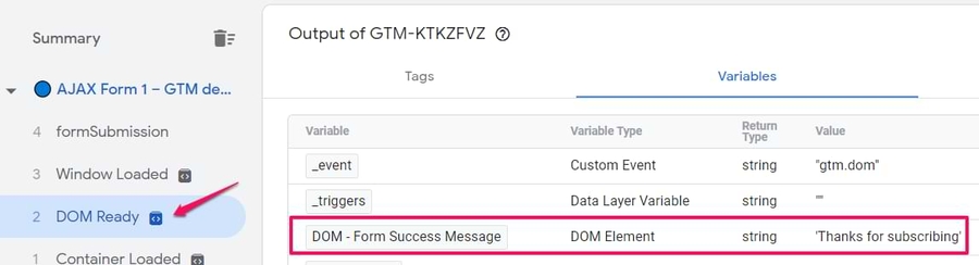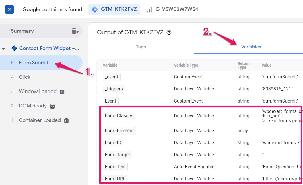 Let’s create a trigger specifically for that form. Remember the Form Submit event that was previously mentioned? Click on it (in Preview and Debug mode), then click Variables.