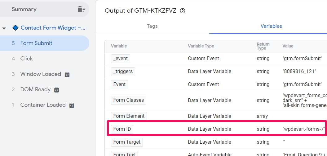 Then scroll down and start looking for any Form variable that is unique for that form. Usually, it will be Form ID variable, on other occasions – Form Classes (but Form ID is a better option). As you can see in the image below, I have submitted a form (of which Form ID variable is wpdevart-forms-7).