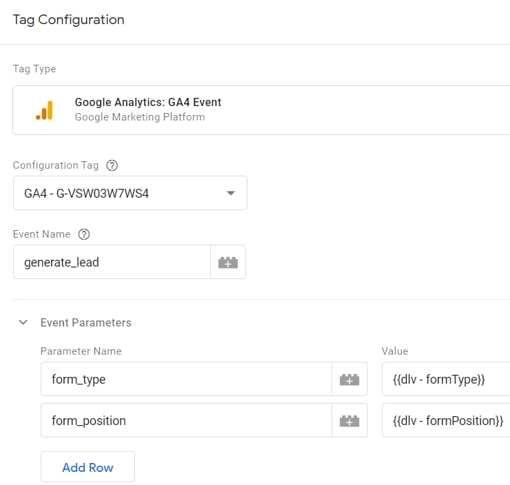 Since I have created two Data Layer variables (formType and formPosition), I can use them in my GA4 event tag. As I have said before in this blog post, there are no strict requirements for how those parameters should be named.