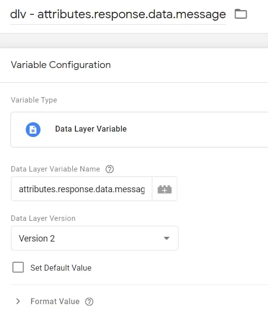 1st variable: Title: dlv – formType Variable type: Data Layer Variable Data Layer Variable Name: formType Leave all other settings as they are