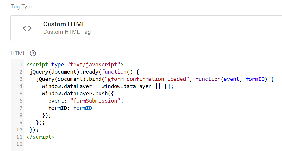 First, you must check how your form works after the successful submission. If it refreshes itself (but not the entire page), implement an auto-event listener with a Custom HTML tag. A listener is a function that listens to particular interactions on a page. In this case, it’s a successful Gravity Form submission. You can either use a ready-made listener (if possible), try to write your own (here’s a guide for non-developers), or ask a developer to help you. A listener must push the event of a successful form submission to the Data Layer.