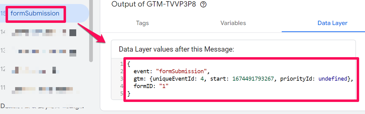 Don’t forget to test the listener with GTM Preview and Debug mode. Load the page with any Gravity Form and complete a test submission. A Data Layer event called formSubmission should appear in the event stream. Click it and check what data was passed to the Data Layer. It should look like this.