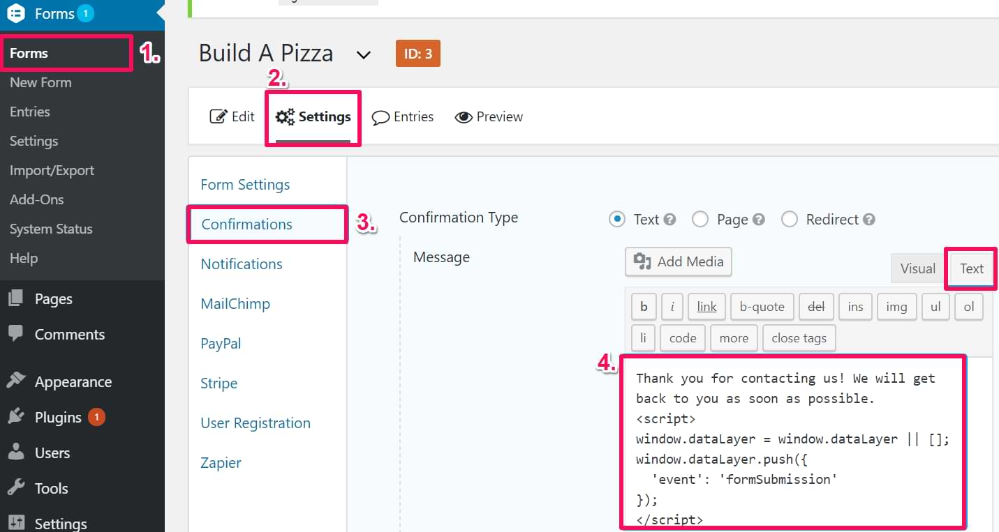 Usually, the Confirmation type is “Text” and what you’ll need to do is add a small JavaScript code there. It will create a Data Layer event, “formSubmission”, which we’ll use later as a trigger.