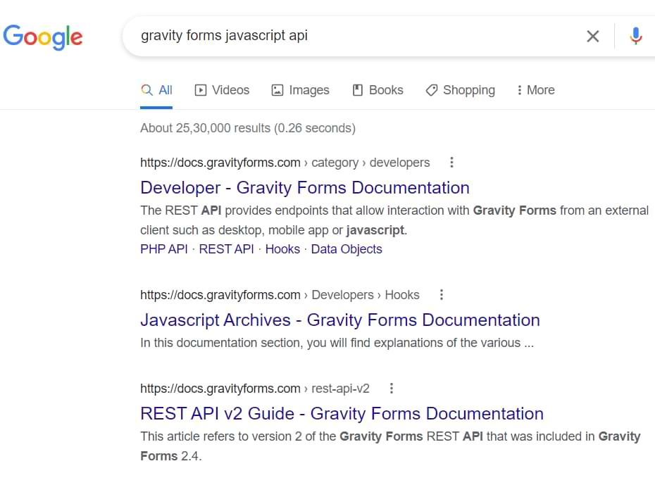 Open Google and enter Gravity Forms Javascript API. It’s crucial that you look for JavaScript API, not regular API. Your search results should look like this: