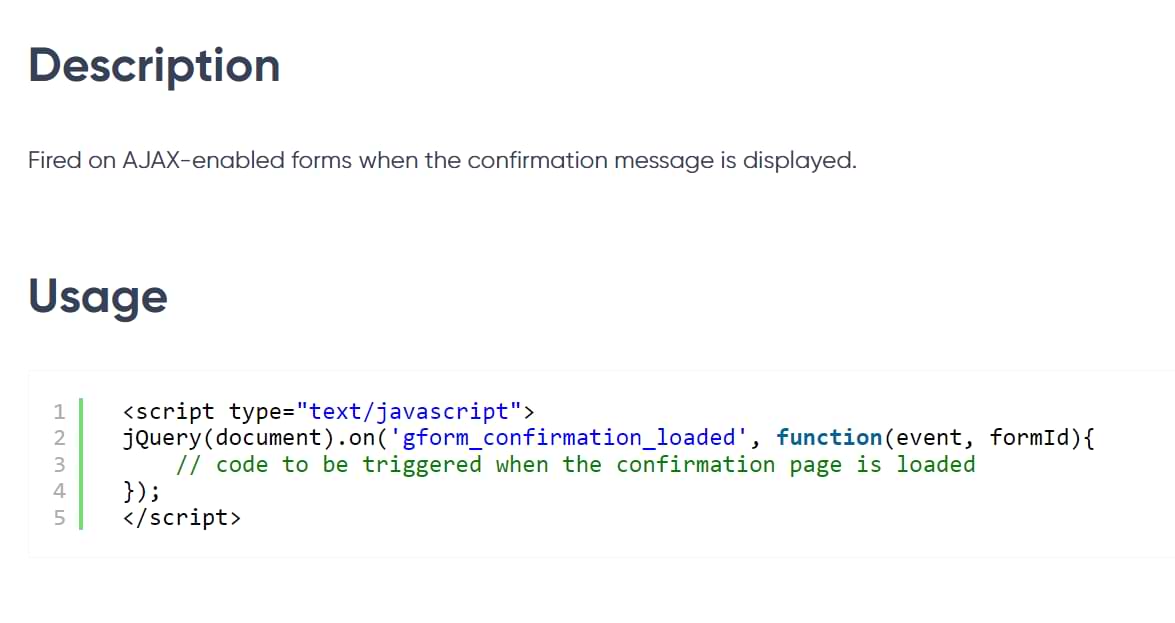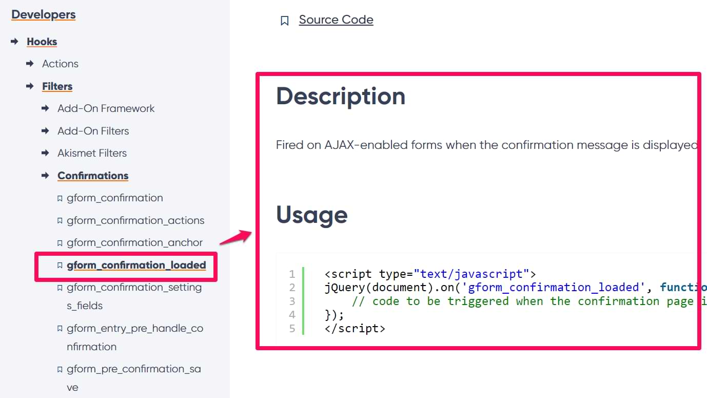 On the left side of the Gravity Forms API reference, you’ll find a navigation bar. Go to Hooks > Filters > Confirmations > gform_confirmation_loaded. This JavaScript hook (gform_confirmation_loaded) fires when the form’s “Success” page is loaded (which is exactly what we’re looking for!).