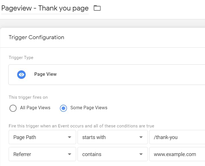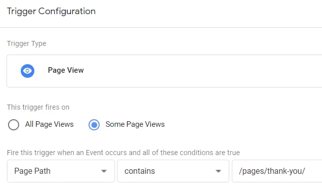 Once again, we will be using the same Pageview trigger that I mentioned several times in the previous sections. If we follow the URL example I previously mentioned (https://example.com/pages/thank-you/), your trigger settings could look like this: