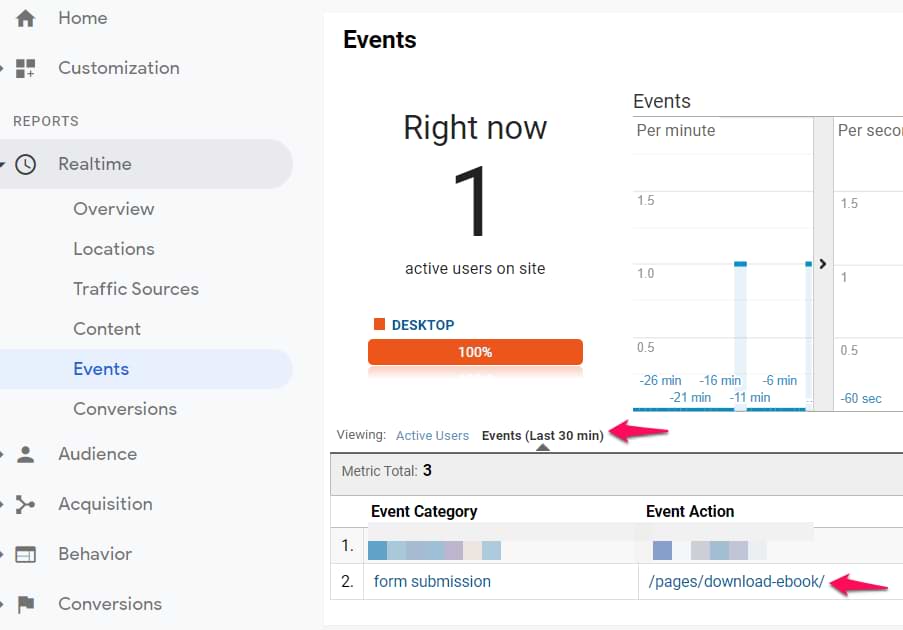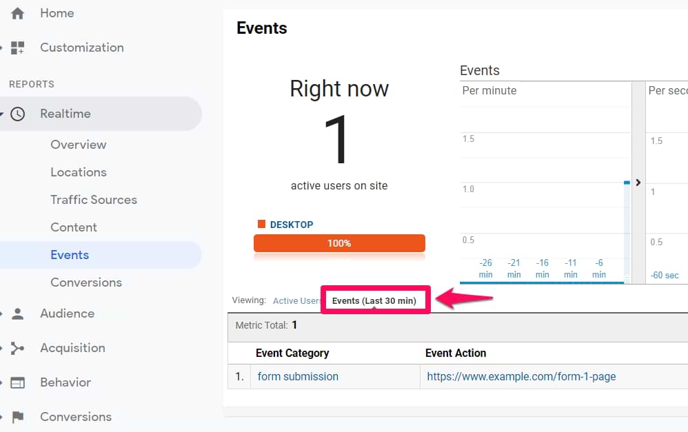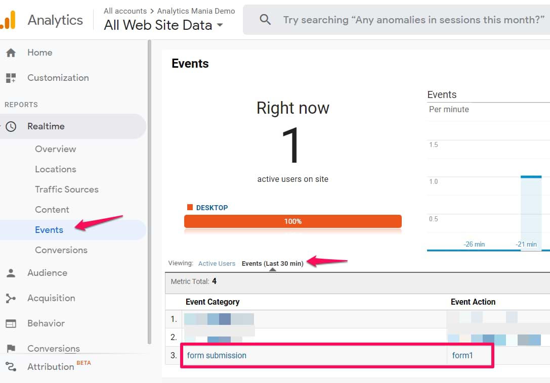 Save all the changes, refresh the GTM preview and debug mode, and submit the form once again. Then go to Google Analytics real-time reports and check whether you see the event in Realtime > Events.