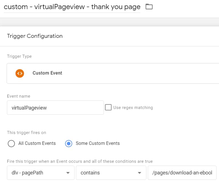 And then create one for EACH form. Here’s an example of one trigger. Basically, I just enter the custom event name that represents a virtual pageview and then make it more precise by entering the form’s URL (pagePath or whatever you are using in your setup)