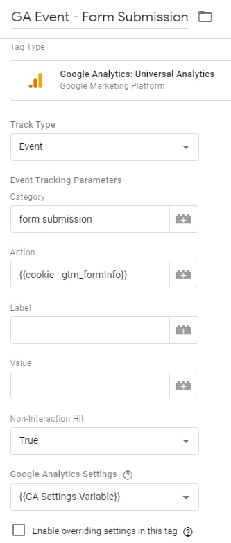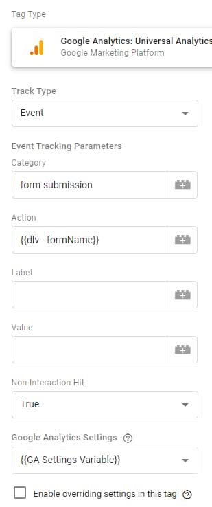 This tag will be fired when a visitor lands on a “Thank you” page. In the “Event Action” field, I inserted the previously created URL Variable. It will return the value of the formName parameter that is visible in the URL of every Thank you page.
