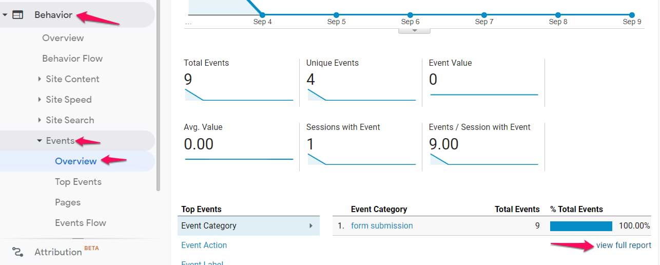 All of these events will appear in Behavior > Events > Overview and then click the View Full Report link.